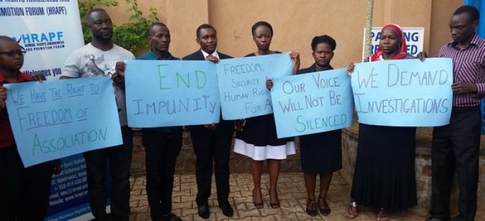 On 22 May 2016, the Human Rights Awareness and Promotion Forum (HRAPF) offices were broken into and the guard on duty was beaten to death. The offices of the Executive Director and Deputy Executive Director broken into and left ransacked, and an unknown number of documents were taken. Other valuable items, such as laptops and other electronics, were left in the offices.